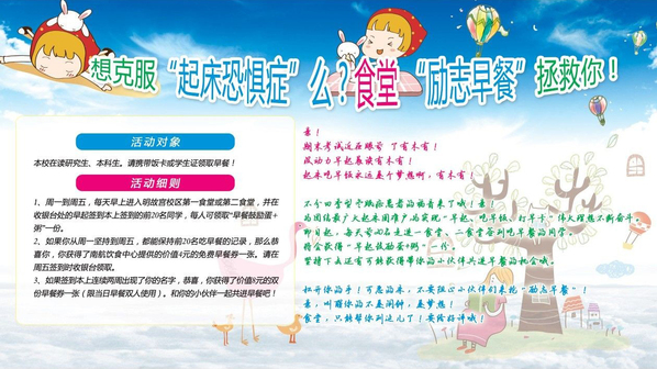 集团还以多种形式关爱学生,2013年,集团饮食服务中心发起“励志早餐”活动,每天前20名走进明故宫校区一食堂、二食堂签到吃早餐的学生,将会获得“早起鼓励蛋+粥”一份,带动学生主动早起、吃早餐、晨读,形成健康的生活习惯。