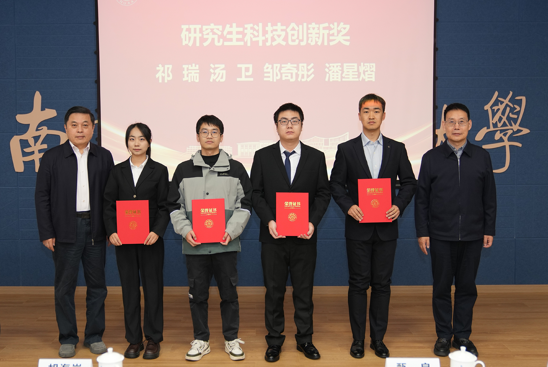 张启钱宣读第三届“胡海岩科技创新奖”获奖名单。胡海岩、甄良共同为青年教师科技创新奖获得者董昊、殷俊,研究生科技创新奖获得者祁瑞、汤卫、邹奇彤、潘星熠颁发证书。