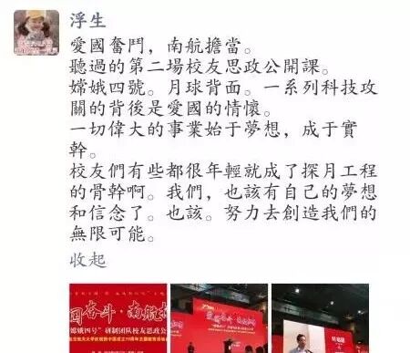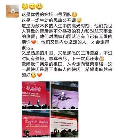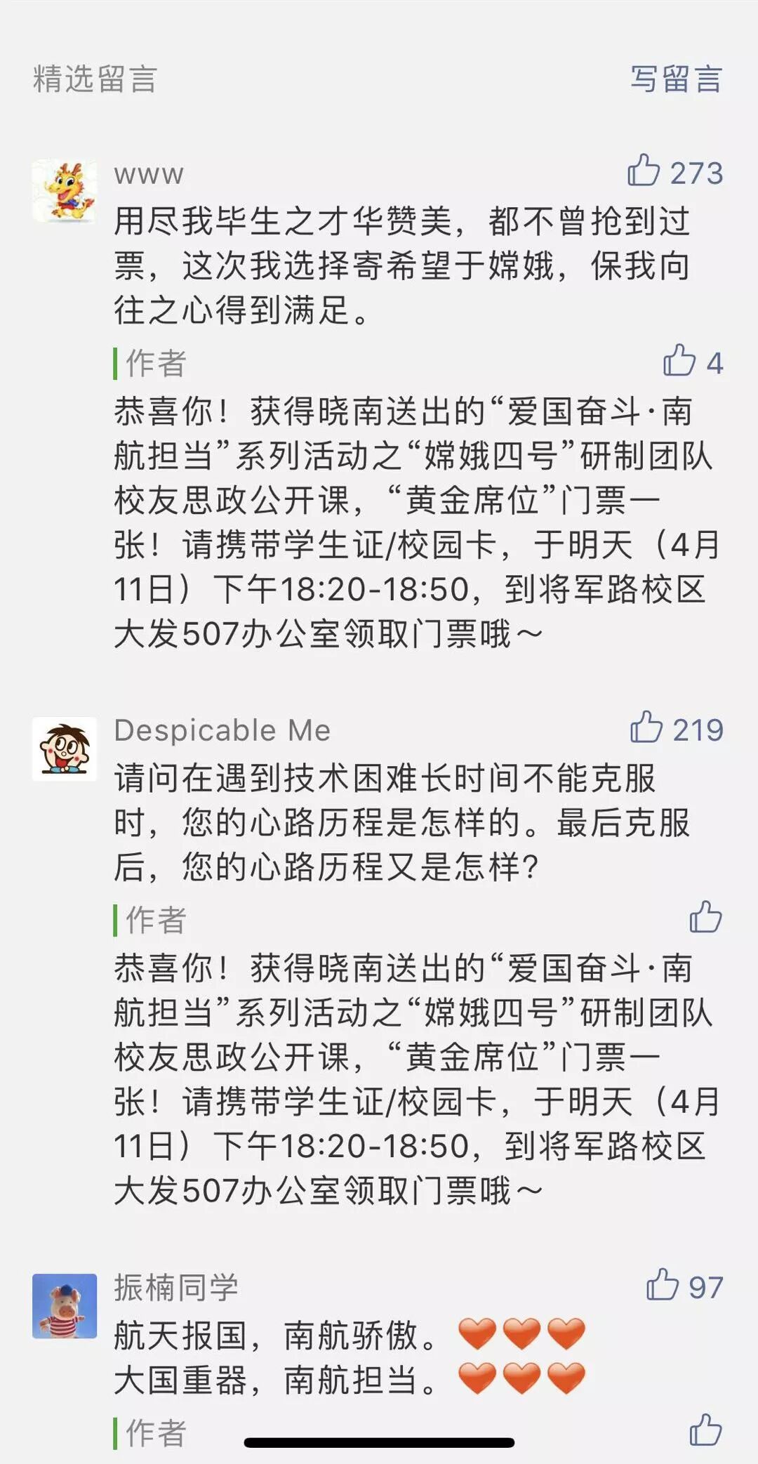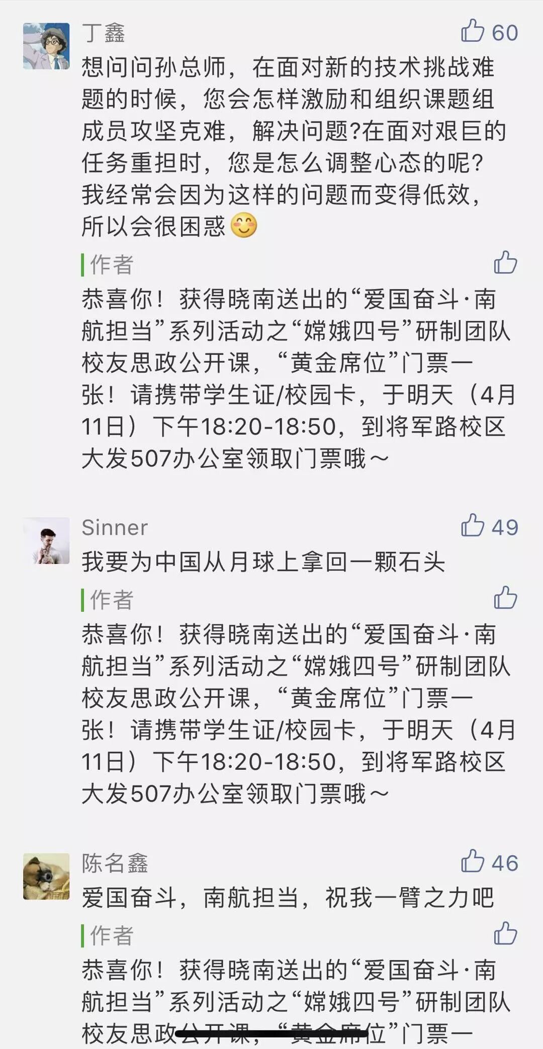 我觉得航天是一个比较浪漫的梦想,航天的梦虽然是在远方,但是路是在我们脚下的,希望大家能够以梦为马,勇往直前,不负韶光!